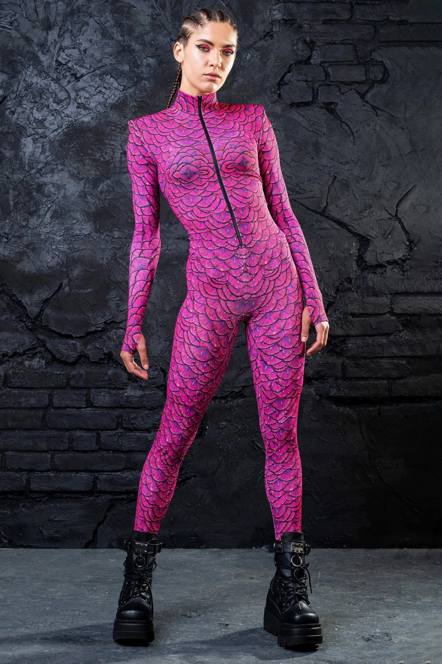 The design features a body con fit, padded shoulders, long sleeves with thumbholes, a mock neckline and a sturdy black zipper in the front.