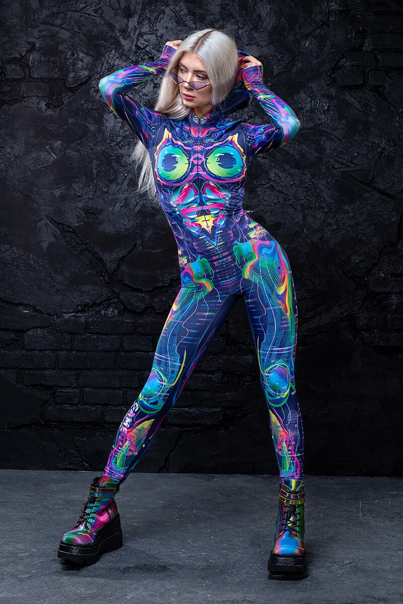 Our Cyber Glitch Fit Onesie is madeĀ from a high quality stretchy and breathable Lycra fabric, that feels wonderful on the skin. Itās printed with outstanding graphics that react to UV light, so you can literally glow.