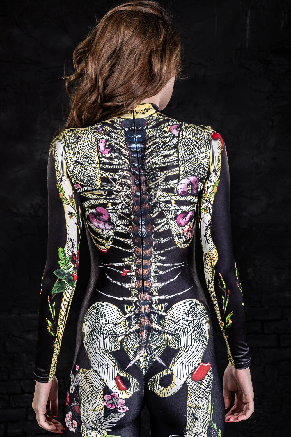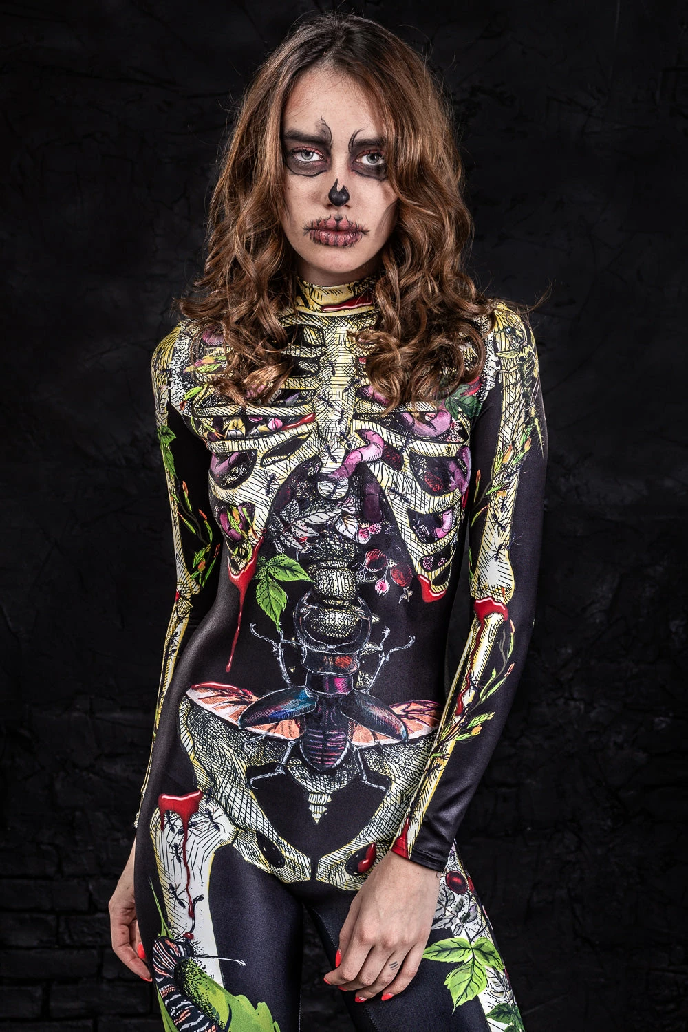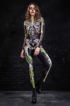 This ultra sleek skeleton costume fits like a glove and holds everything in place. It’s form-fitting construction is flattering and sucks you in. The highest quality lycra fabric is compfy and stretchy and feels luxx on the skin. The bodysuit is warm enough for the Halloween night out, but not too hot for the dance floor!