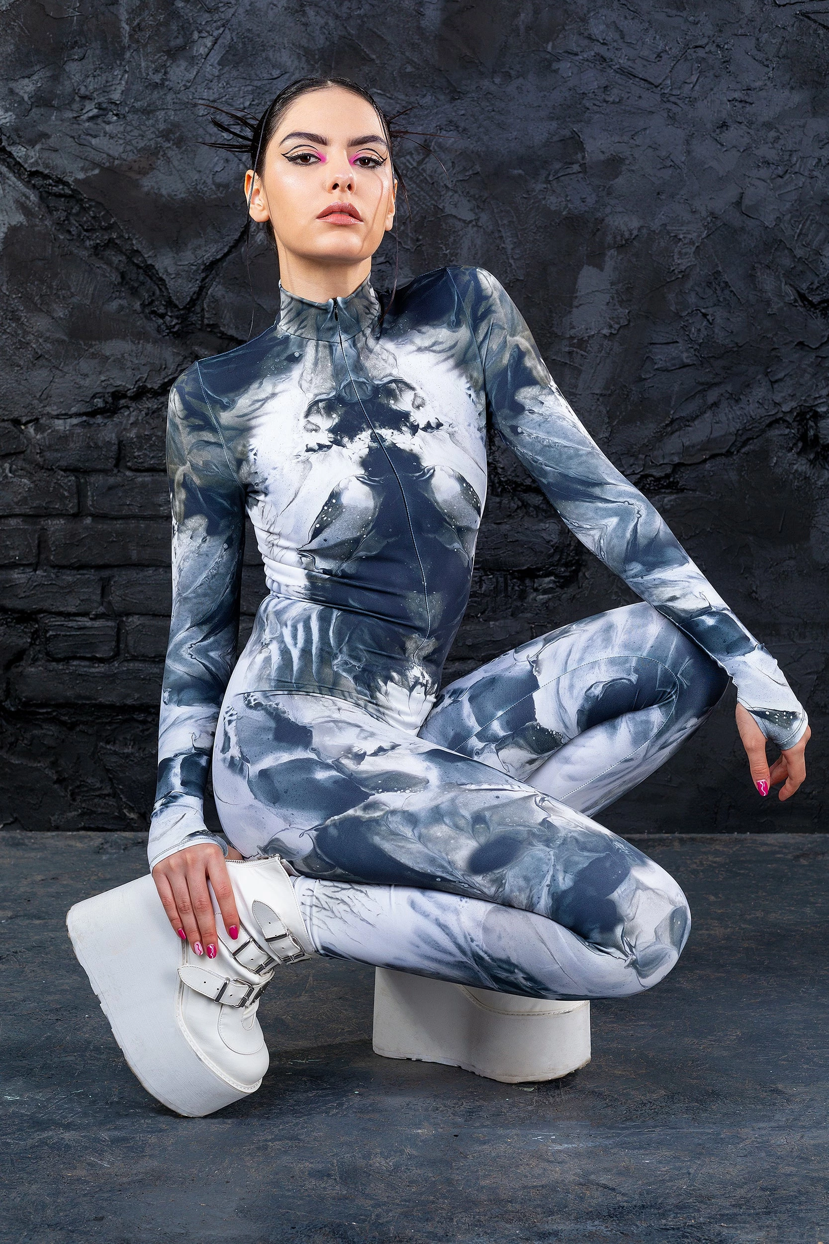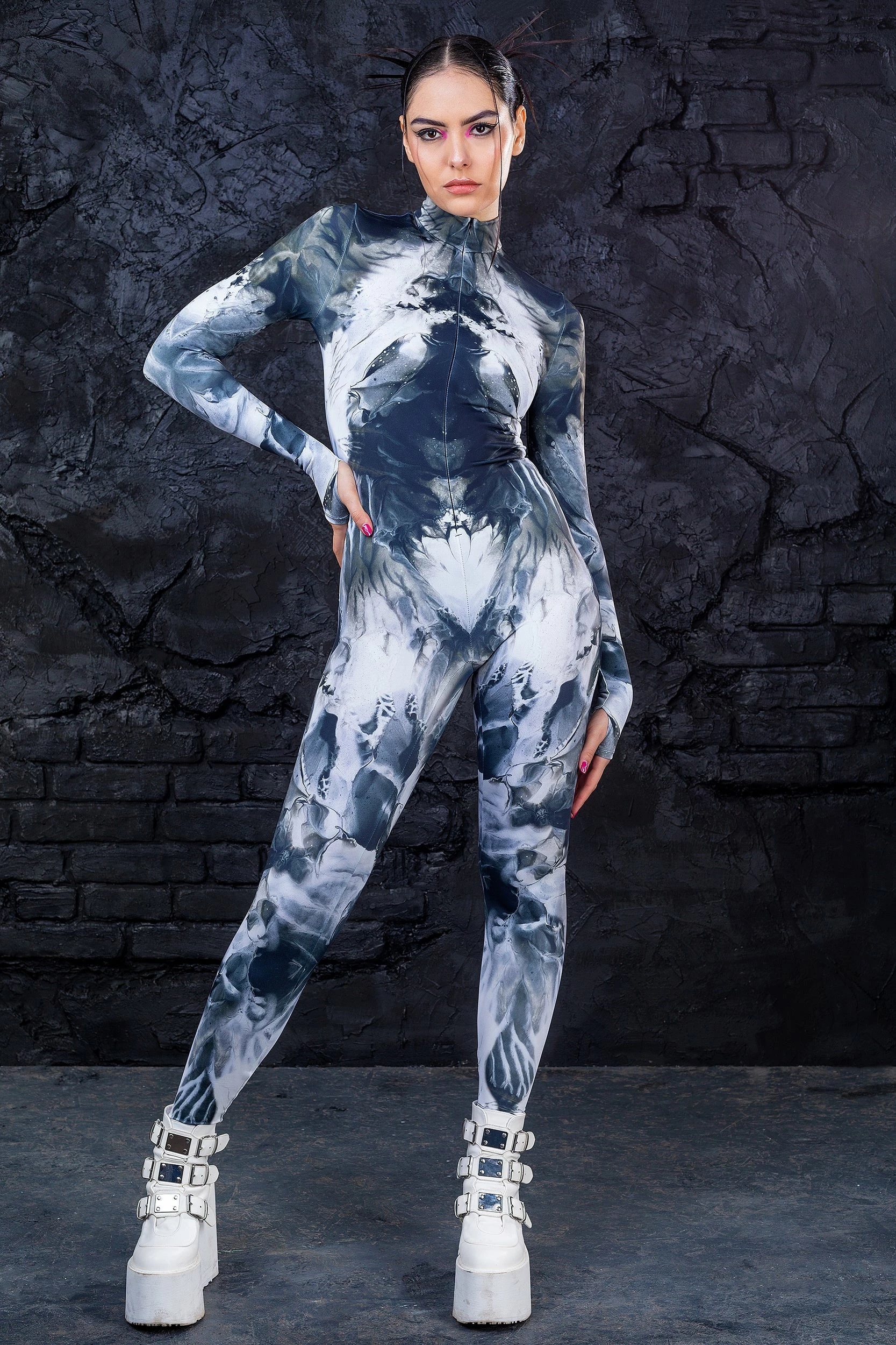 Conquer the rave scene in our Ink Spill Asymmetrical Bodysuit.