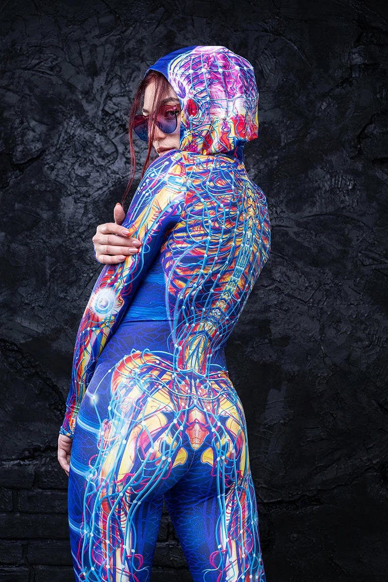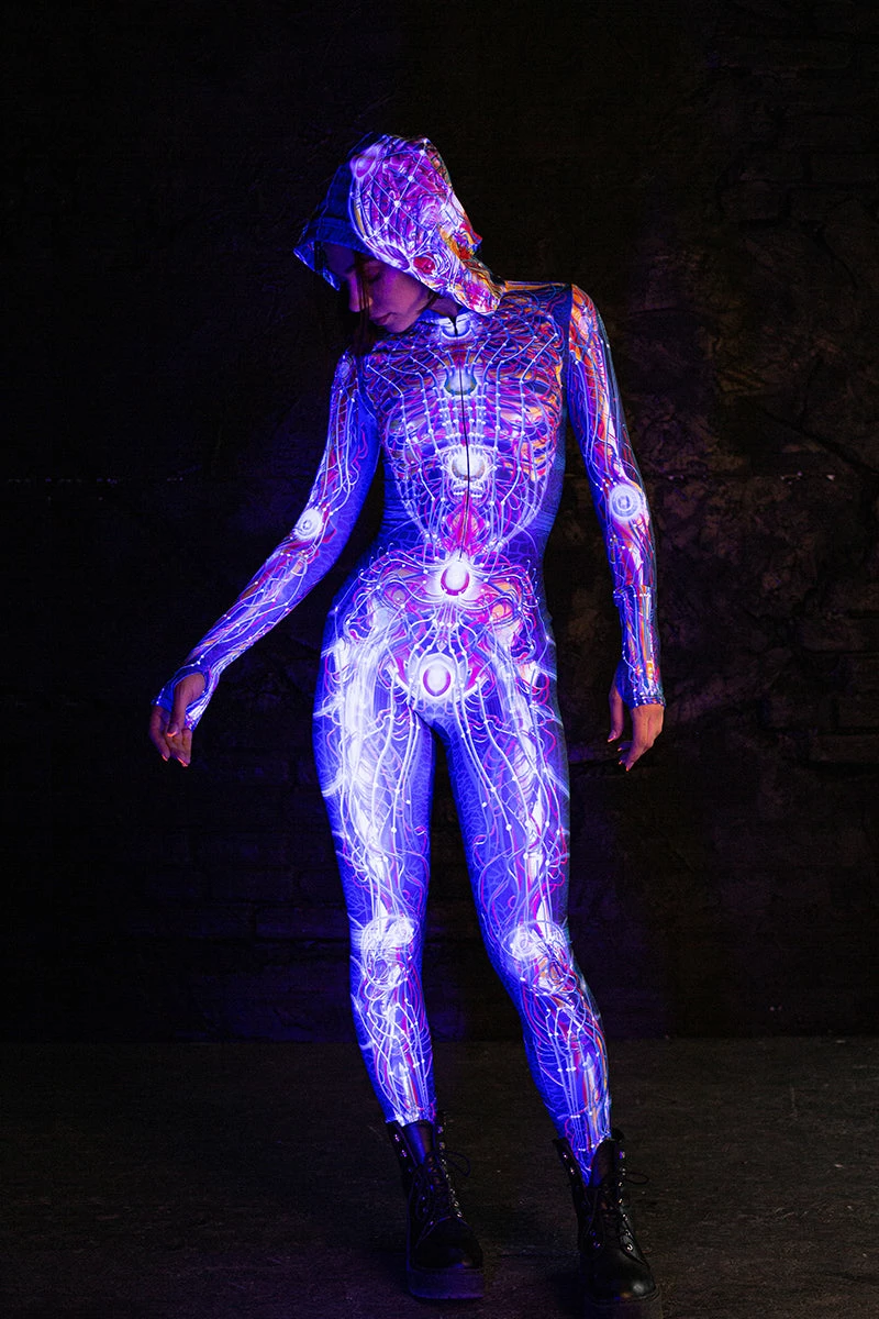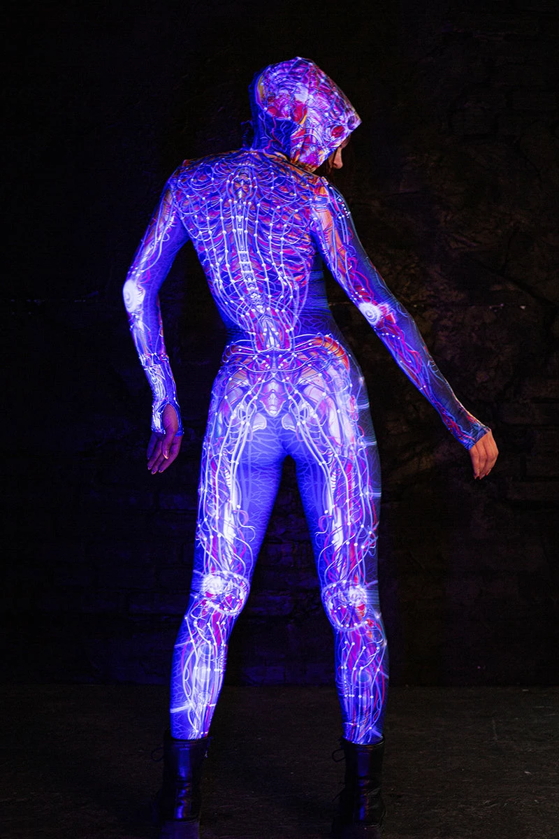 This piece is made from a high quality stretchy and breathable Lycra fabric, that feels wonderful on the skin. Itās printed with outstanding graphics that react to UV light, so you can literally glow.