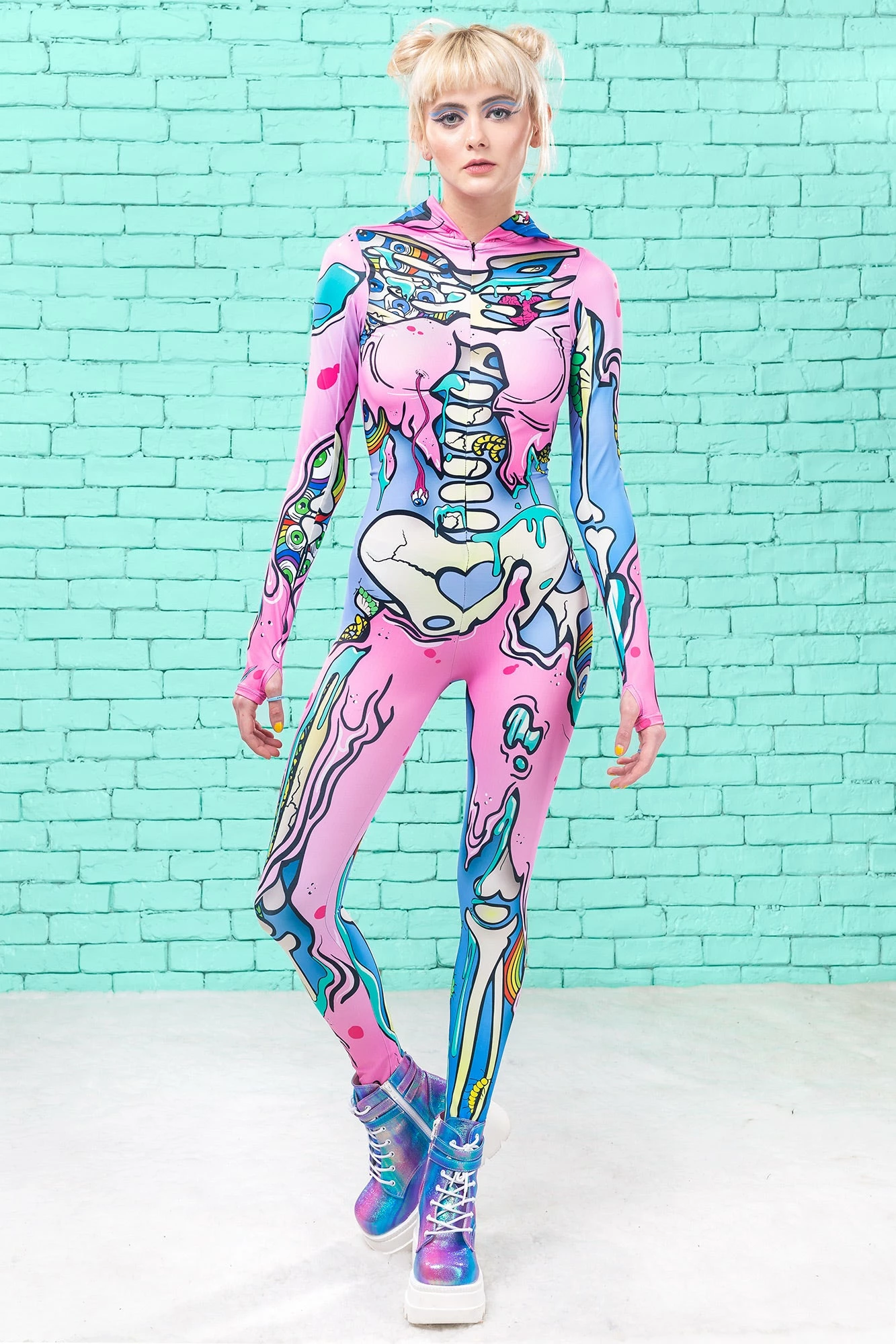 Hey candy gal, here’s a cute and freaky zombie bodysuit that will have ‘em dead! This hooded costume has a high quality print all over that is crisp and vivid live and does not distort when stretched. The texture and softness of this piece are superior, but better not let ‘em touch ya cuz they’ll be hangry for more! The hidden front zip closure and the printed lining in the hood make this costume everything you’ve dreamt of and more.
