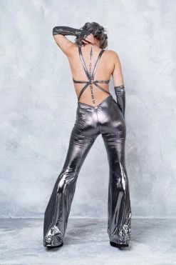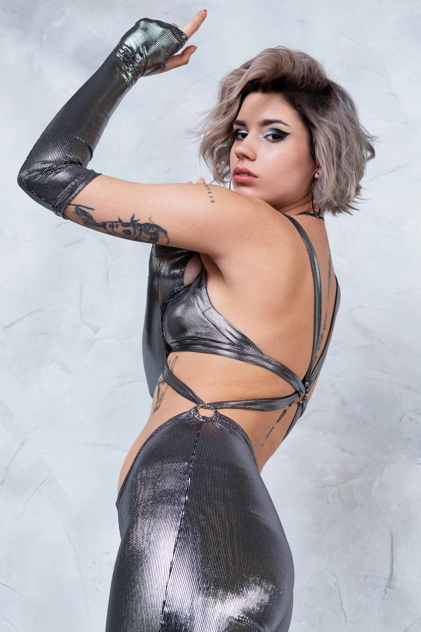 This fit is a one way ticket to the centre of the dance floor. Steal the show wearing our Monochrome Ring Catsuit. The design includes a triangle top, booty hugginβ bell bottom pants connected with ties and o-ring detailz, all coming together at the back. Includes long fingerless gloves as well. The perfect recipe for an unforgettable outfit.