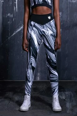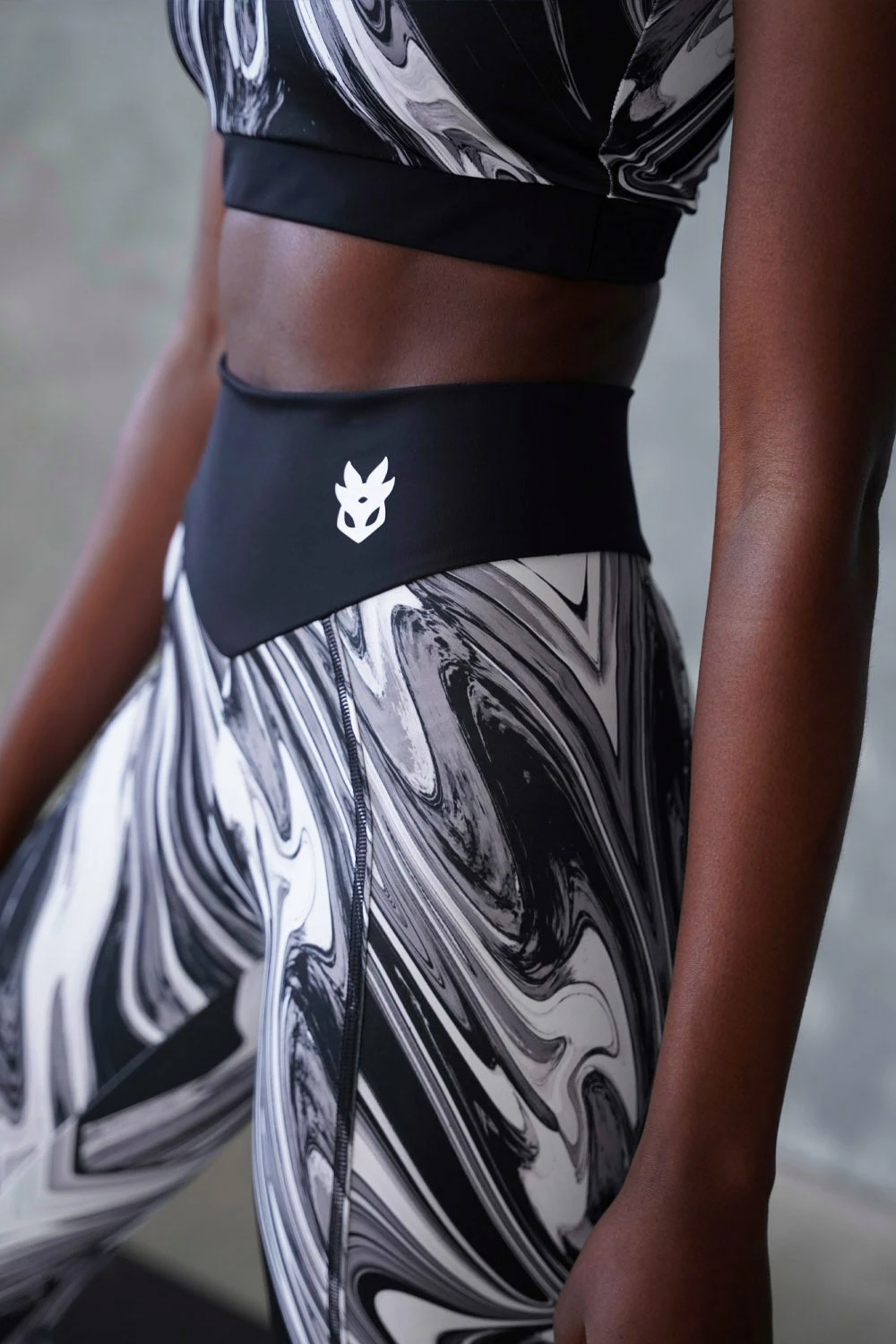 Explore the beauty of the Space Abyss and become a glorious Space Girl yourself with our designer cuts, vivid print in black-and-white, and crossed-over back straps, coupled with an underbust band in the top, high waist, and supported waistband in the leggings that are available in three lengths.