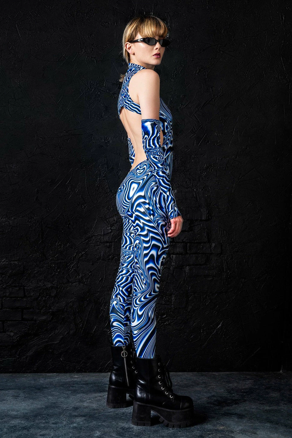 The sleeveless design features a body con fit, a mock neckline and a sexy backless situation. Comes with cute fingerless gloves to match. A summer festival must have if you ask us.
