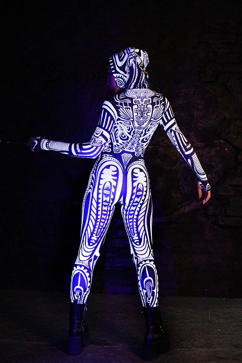 This piece is made from a high quality stretchy and breathable Lycra fabric, that feels wonderful on the skin. Itās printed with outstanding graphics that react to UV light, so you can literally glow.
