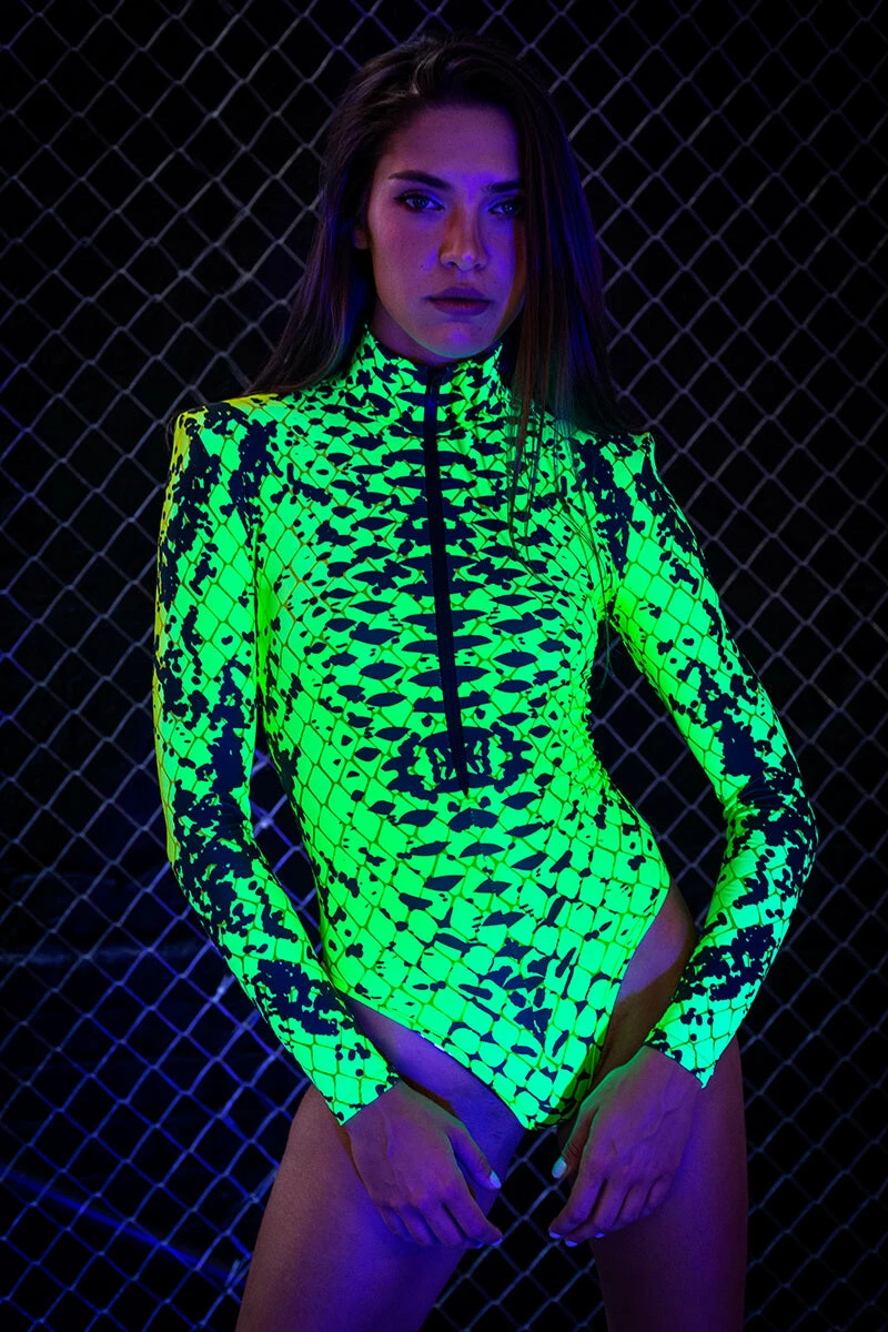 TheĀ SeriousĀ UV Reptile Bodysuit will get you hype experience aligned to a whole new BadassĀ level.Ā Featuring a shoulder pad design with aĀ front zip and long sleeve design with a wrap over front, you’ll wanna add this to your basket. It also has special UV fabric fibers for unbelievable illumination in black light